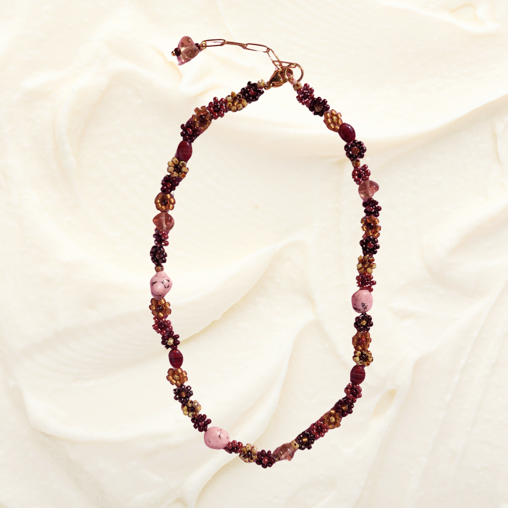 Rich, dark cocoa and sweet hazelnuts… that’s NOCCIOLA! This delicious necklace features a curated selection of high quality Czech glass beads in shades of brown, in perfect harmony with baby pink and amber accents. Perfect for autumn or all-year-round, it’s cozy yet elegant at the same time.