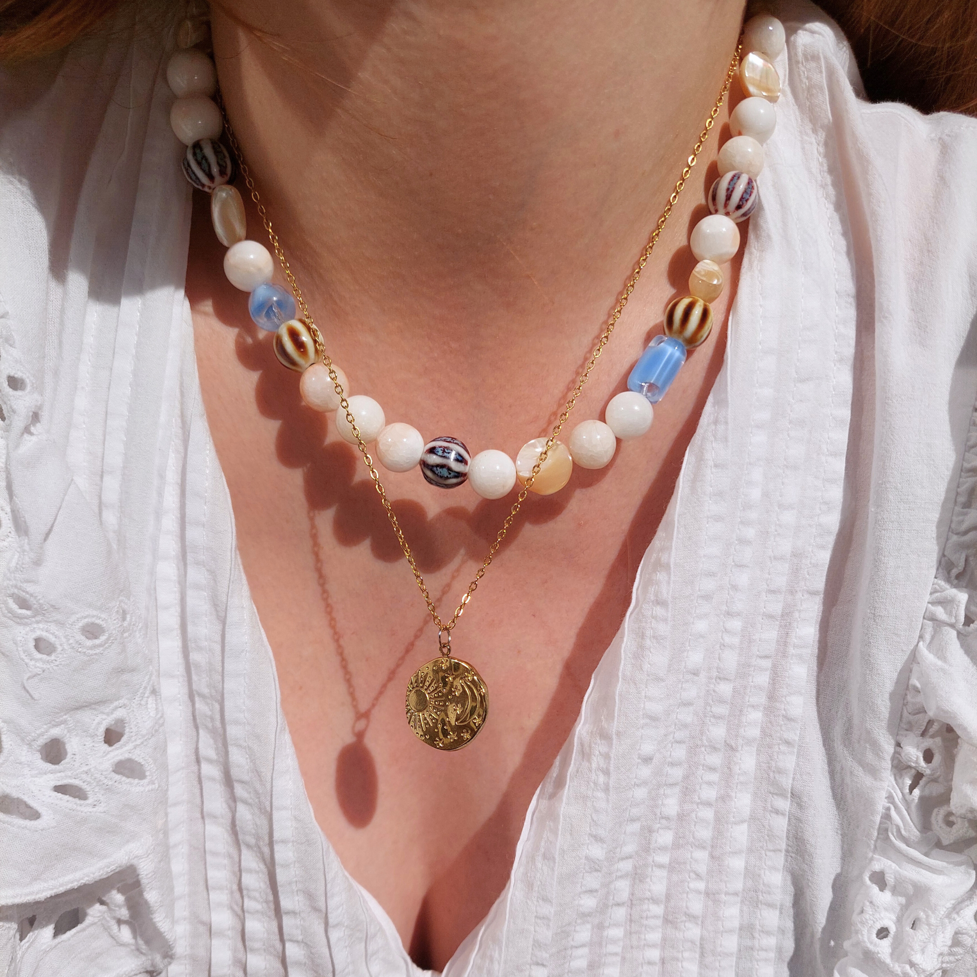 Creamy marble and frequent coffee breaks… This decadent, chunky necklace takes you to Rome, inspired by its irresistible architecture, blue skies and retro bar-pasticceria shops.
